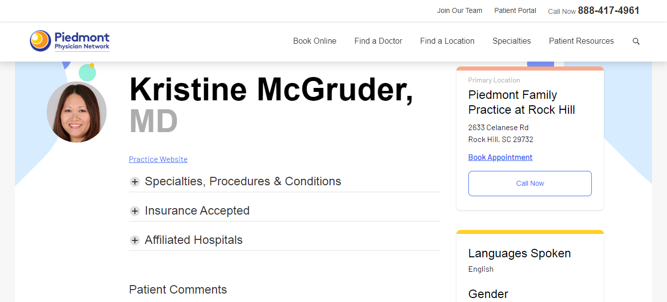 Kristine McGruder, MD is a highly experienced family medicine doctor who specializes in treating a wide range of conditions, including breast conditions, joint disorders, spinal cord injury, thyroid disorders, abdominal pain, respiratory disease, pneumonia, blood clots, and osteoarthritis. Dr. McGruder is affiliated with several hospitals in the area and accepts a variety of insurance plans. Patients have praised Dr. McGruder for her thoroughness, as well as the friendly check-in staff at her practice. Dr. McGruder is located at Piedmont Family Practice in Rock Hill, South Carolina, and is fluent in English. Appointments can be booked online or by calling the office.
