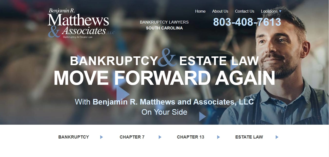 Benjamin R. Matthews and Associates, LLC in Rock Hill, South Carolina is a leading bankruptcy law firm that focuses on helping individuals and businesses navigate the complex bankruptcy process. Experienced bankruptcy attorneys provide comprehensive legal services, including creditor negotiation, financial reorganization, asset protection, and debt relief. They are committed to helping clients understand their rights and obligations under the Bankruptcy Code, including Chapter 7, Chapter 11, liquidation, and reaffirmation agreements. They also assist clients with understanding the tax consequences of filing for bankruptcy, and provide legal advice on the creation of liquidation and reorganization plans, as well as bankruptcy trustee responsibilities. With expertise and knowledge in bankruptcy law, clients can protect their assets and discharge debt. They are also available to help clients understand the automatic stay that is triggered when they file for bankruptcy.