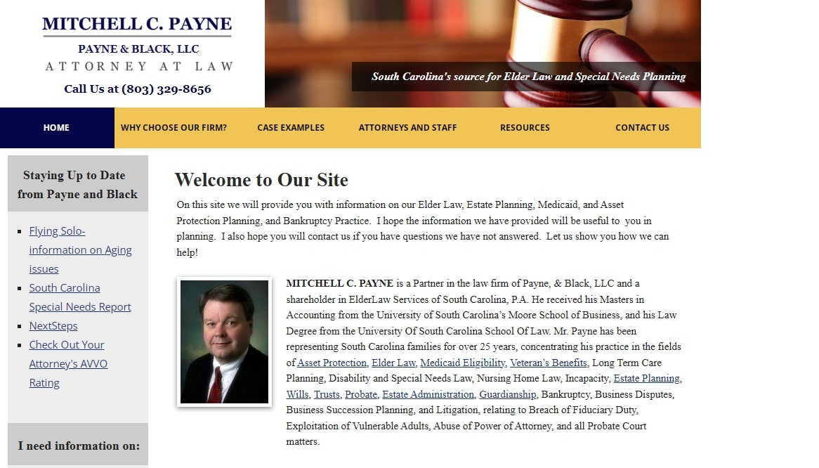 Payne & Black, LLC, located in Rock Hill, SC, is a trusted bankruptcy law firm led by Mitchell C. Payne. With over 25 years of experience, Payne & Black, LLC provides expert legal counsel in the fields of Asset Protection, Elder Law, Medicaid Eligibility, Veteran’s Benefits, Long Term Care Planning, Disability and Special Needs Law, Nursing Home Law, Incapacity, Estate Planning, Wills, Trusts, Probate, Estate Administration, Guardianship, Bankruptcy, Business Disputes, Business Succession Planning, and Litigation. Their attorneys are well-versed in all aspects of bankruptcy law, offering personalized advice and assistance to individuals and businesses in the Rock Hill area. Payne & Black, LLC is committed to providing quality legal services and protecting the rights of their clients.